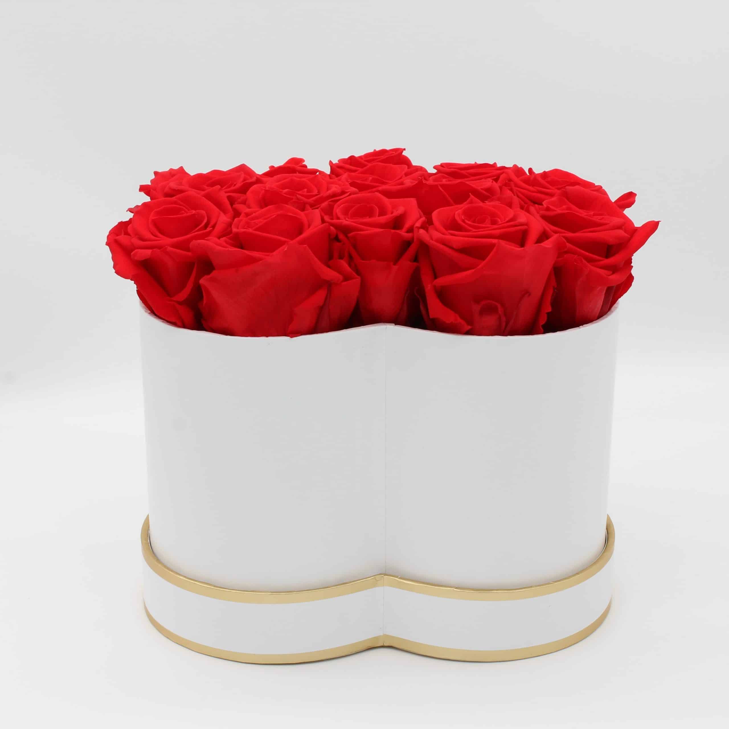 UNSERE FLOWER- BOX: Die Box besteht aus hochwertigem und stabilem Karton in weiß Herzform mit goldener Umrandung
